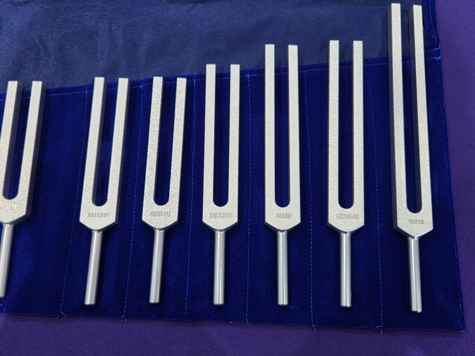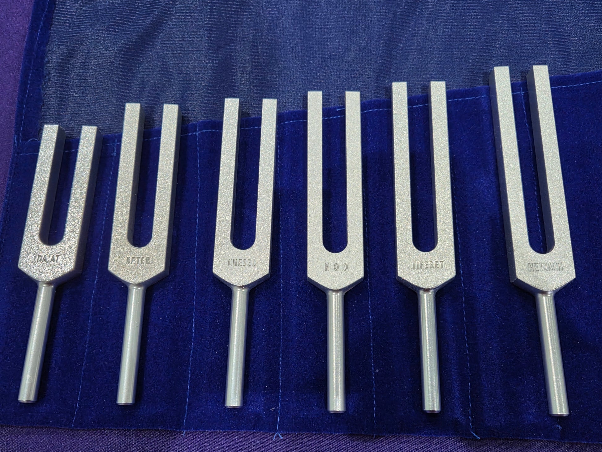 The Kabbalah TREE OF LIFE Tuning Fork Set has 12 forks. It is also called the Sephiroth Set. The Kabbalah TREE OF LIFE has 10 sephirah. The 1st 10 tuners are for each of them. The 11th Tuner is for the non-visible Da'ath. The 12th Tuner is the Lightening Flash which reunites all life that is manifested.
