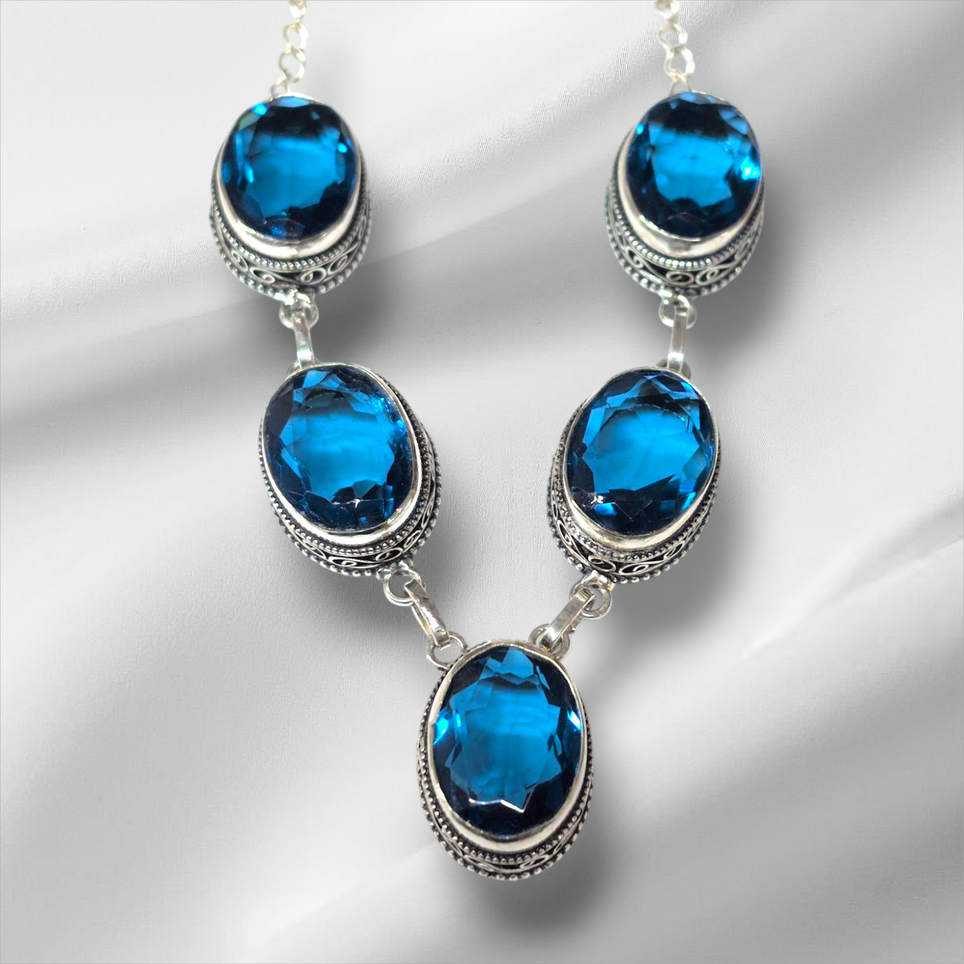 Stunning blue necklace, weighs 46g, each stone is approx. 20 x 15 x 10mm, hanging length approx 23cm.